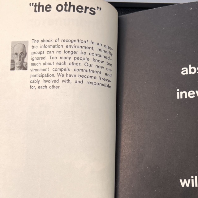 “The shock of recognition! In an electric information environment, minority groups can no longer be contained—ignored. Too many people know too much about each other. Our new environment compels commitment and participation. We have become irrevocably involved with, and responsible for, each other.”