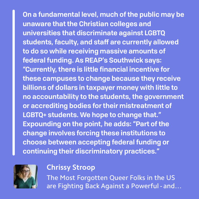 On a fundamental level, much of the public may be unaware that the Christian colleges and universities that discriminate against LGBTQ students, faculty, and staff are currently allowed to do so while receiving massive amounts of federal funding. As REAP’s Southwick says: