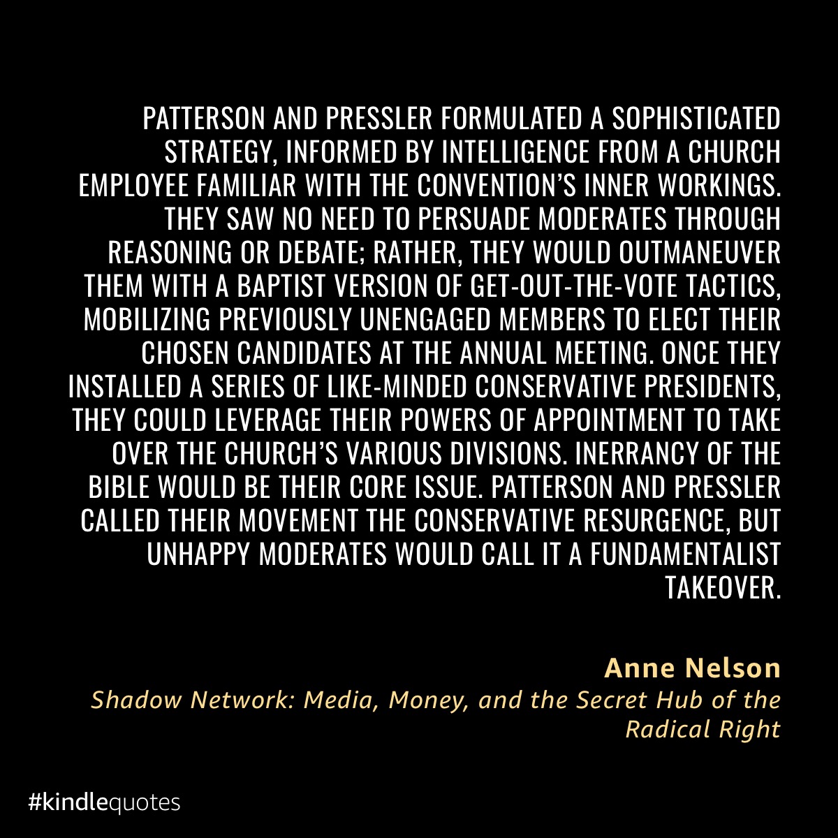The Conservative Resurgence in the SBC was spearheaded by two men, Paul Pressler & Paige Patterson. As described by Anne Nelson in her book Shadow Network, they began coordinating their campaign over concern “about their church’s alarming lurch toward liberalism.”2 So they devised a plan: