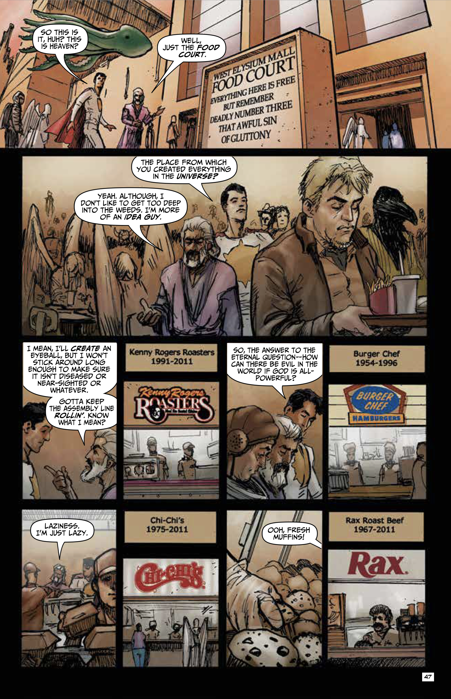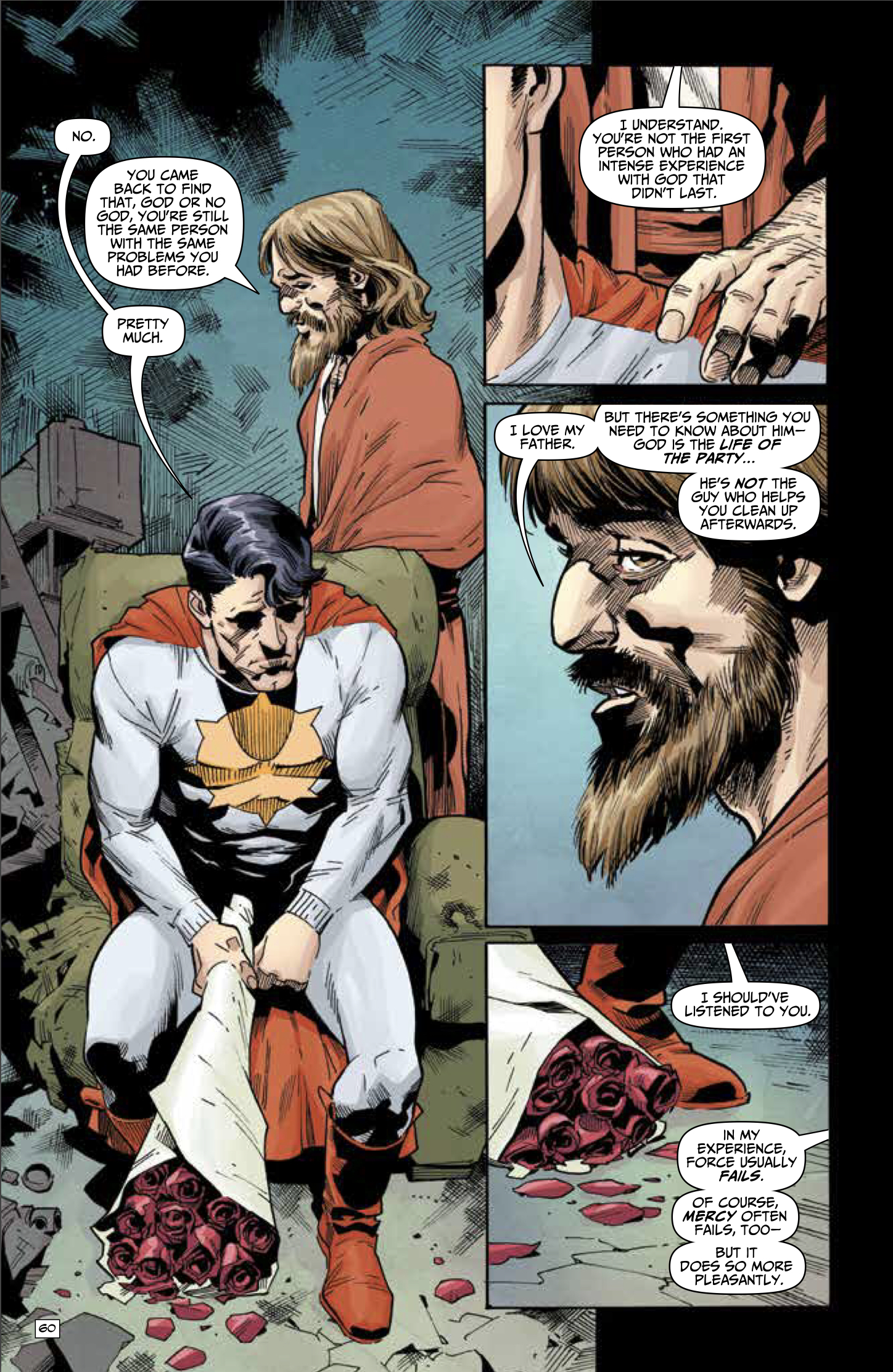 Over the course of the volume, Sunstar’s approach to crime-fighting changes. At one point, God intervenes and brings Sunstar to Heaven for a chat. They share a meal at Heaven’s food court, sampling from fast food franchises that have gone to The Great Beyond, and God makes this confession: