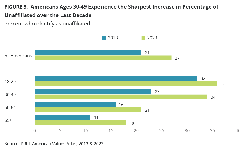 Further, this isn’t just “the youth” being led astray by strangers on the internet using hashtags. PRRI notes that every age group has seen an increase in being unaffiliated.