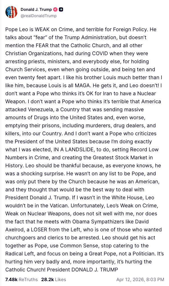 Unsatisfied with the mindshare Jesus of Nazareth was receiving on Easter, he posted about his ongoing war in Iran, threatening: