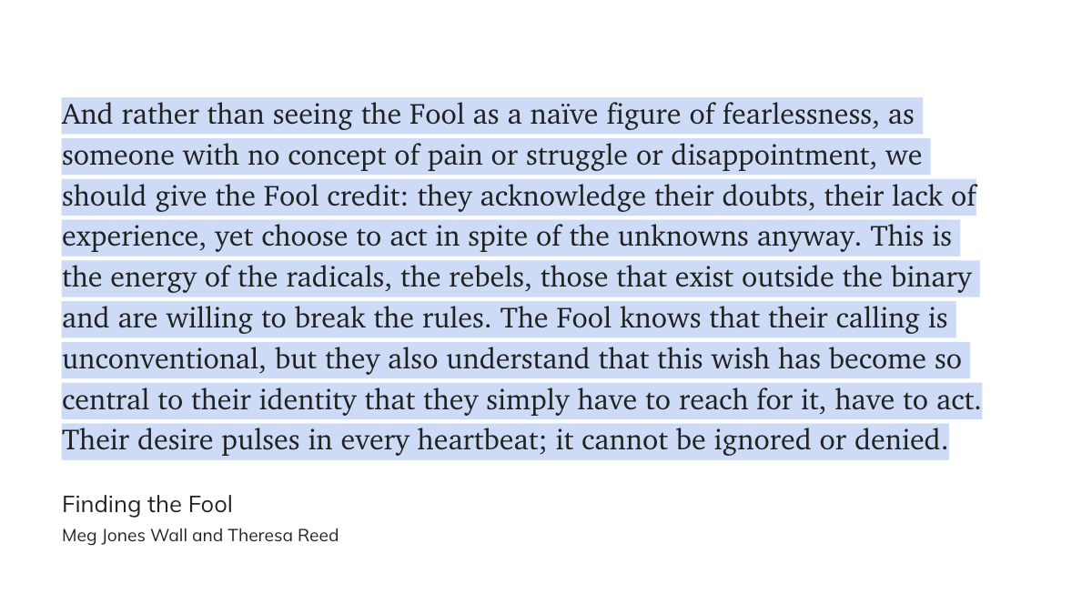 I’m in a stage where a lot “spiritual” things don’t resonate with me as they once did. Those nerve endings are shot. That being said, I still remain fascinated with symbolism & metaphor, and tarot is chock full of it. I also appreciate that, just as the enneagram before it, many exvangelicals have turned to tools like tarot to become familiar with intuitive knowledge after being told to not trust one’s self. Finding the Fool byis going to serve as my personal 101-course into this tradition.1